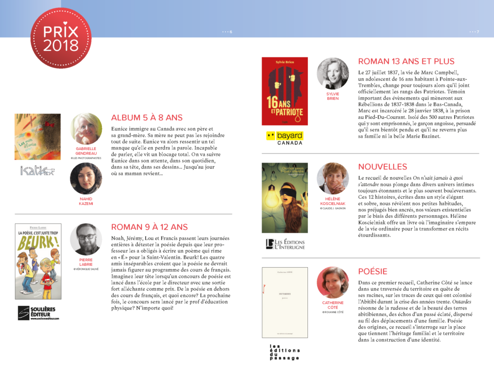 Les auteurs lauréats reçoivent une bourse de 500 $ offerte par l’AQPF. Les éditeurs de ces livres reçoivent un crédit de 500 $ de Marquis Imprimeur et un crédit de 500 $ de Rolland.